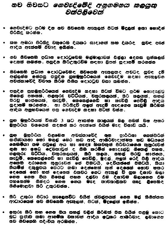 Building a New house or the First occupation of a new house It is an important event in a life of a person or a family. An auspicious moment is selected according to the place where the house is situated and the times of births of the family members. Certain months "Kona Masa" are considered unsuitable due to seasonal changes. Auspicious Dates in 2002 are the following but you need to consult a good astrologer to check which days are the best suited according to the times of births of the family members and find out the auspicious moment in regard to the location of the house. If you can not find a suitable astrologer locally, then you can consult this site. For more information about what is an auspicious day and what is an auspicious time please click here. Auspicious Dates - For start Building- 2002 Mar. 15 Auspicious Dates - For first occupation of a building - 2002 Feb. 25